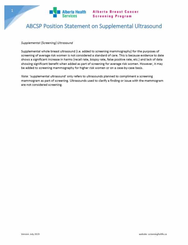 1 ABCSP Position Statement on Supplemental Ultrasound Supplemental (Screening) Ultrasound Supplemental whole breast ultrasound (i.e. added to screening mammography) for the purposes of screening of average risk women is not considered a standard of care. This is because evidence to date shows a significant increase in harms (recall rate, biopsy…
