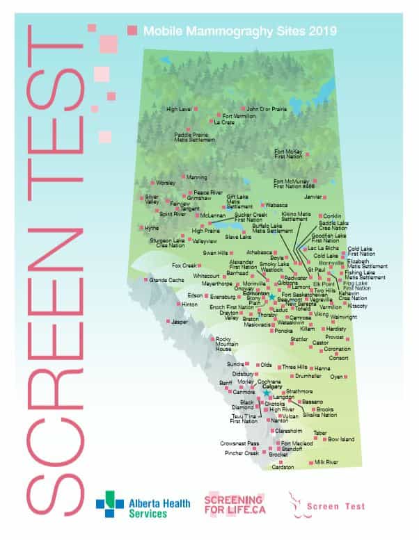 Mobile Mammograghy Sites 2019 High Level John D'or Prairie Fort Vermilion La Crete Paddle Prairie Metis Settlement Fort McKay First Nation Worsley Manning Fort McMurray First Nation #468 Peace River Gift Lake Janvier Grimshaw Metis Fairview Wabasca Settlement Tangent Kikino Metis Spirit River Sucker Creek McLennan Conklin Settlement First Nation…