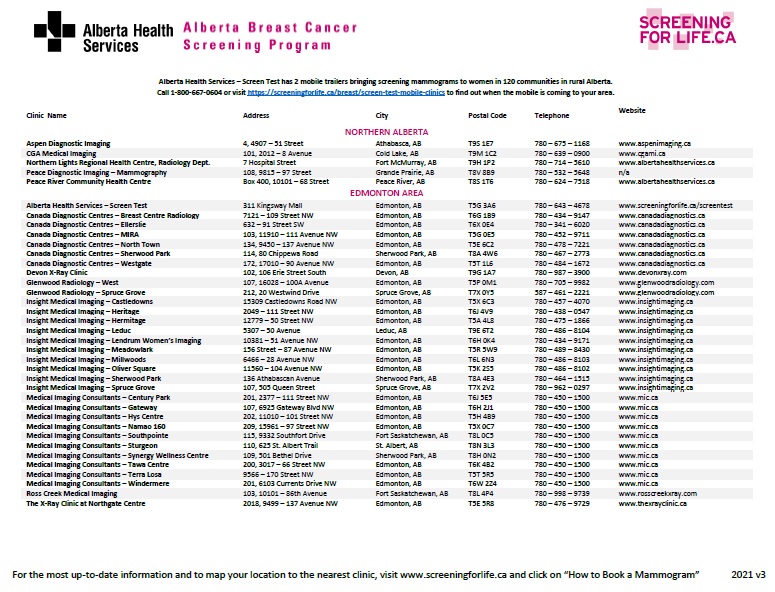 Alberta Health Services – Screen Test has 2 mobile trailers bringing screening mammograms to women in 118 communities in rural Alberta. Call 1‐800‐667‐0604 or visit www.screeningforlife.ca/screentest to find out when the mobile is coming to your area. Clinic Name Address City Aspen Diagnostic Imaging CGA Medical Imaging (Cold Lake) Inc.…