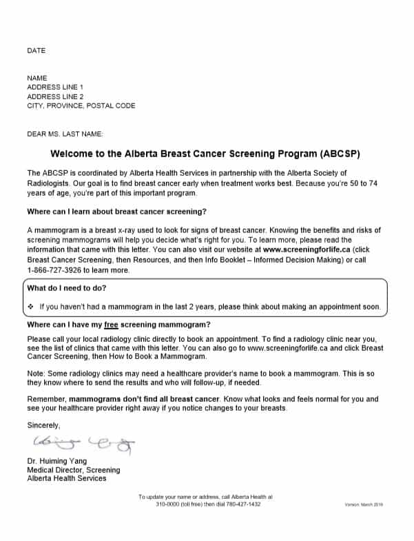 DATE NAME ADDRESS LINE 1 ADDRESS LINE 2 CITY, PROVINCE, POSTAL CODE DEAR MS. LAST NAME: Welcome to the Alberta Breast Cancer Screening Program (ABCSP) The ABCSP is coordinated by Alberta Health Services in partnership with the Alberta Society of Radiologists. Our goal is to find breast cancer early when…
