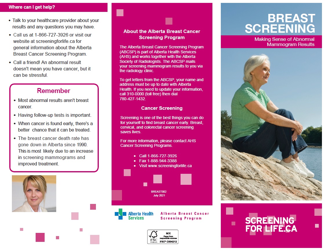 Where can I get help? • Talk to your healthcare provider about your results and any questions you may have. • Call us at 1-866-727-3926 or visit our website at screeningforlife.ca for general information about the Alberta Breast Cancer Screening Program. • Call a friend! An abnormal result doesn't mean…