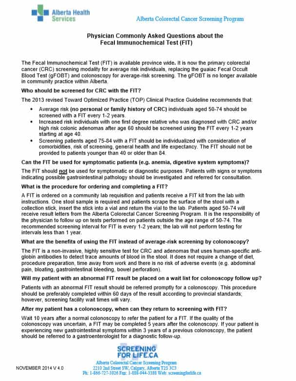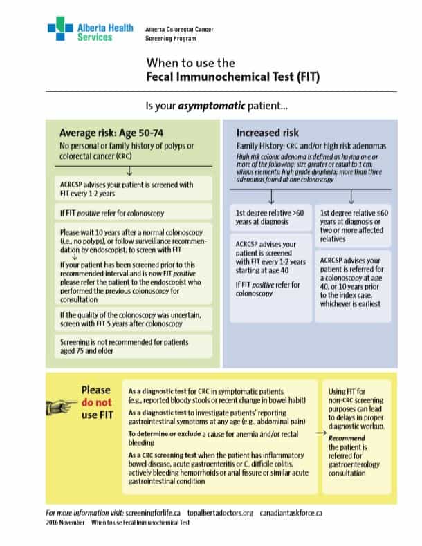 Alberta Colorectal Cancer Screening Program Physician Commonly Asked Questions about the Fecal Immunochemical Test (FIT) The Fecal Immunochemical Test (FIT) is available province wide. It is now the primary colorectal cancer (CRC) screening modality for average risk individuals, replacing the guaiac Fecal Occult Blood Test (gFOBT) and colonoscopy for average-risk…