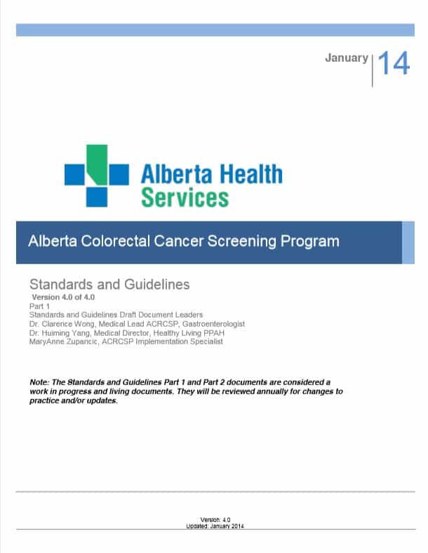January Alberta Colorectal Cancer Screening Program Standards and Guidelines Version 4.0 of 4.0 Part 1 Standards and Guidelines Draft Document Leaders Dr. Clarence Wong, Medical Lead ACRCSP, Gastroenterologist Dr. Huiming Yang, Medical Director, Healthy Living PPAH MaryAnne Zupancic, ACRCSP Implementation Specialist Note: The Standards and Guidelines Part 1 and Part…
