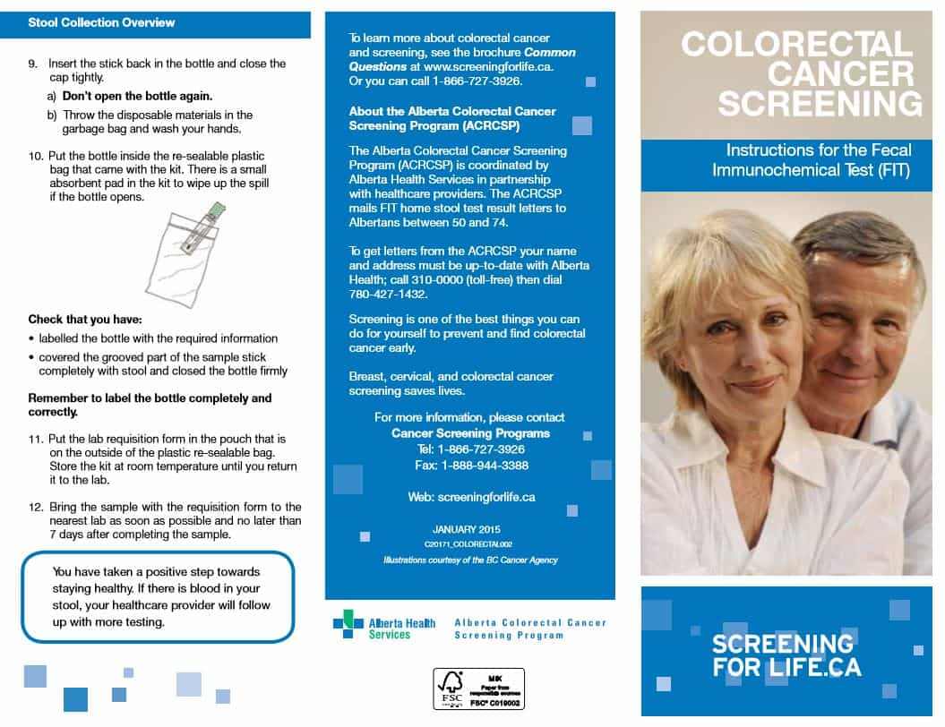 Stool Collection Overview 9. Insert the stick back in the bottle and close the cap tightly. To learn more about colorectal cancer and screening, see the brochure Common Questions at www.screeningforlife.ca. Or you can call 1-866-727-3926. a) Don’t open the bottle again. b) Throw the disposable materials in the garbage…