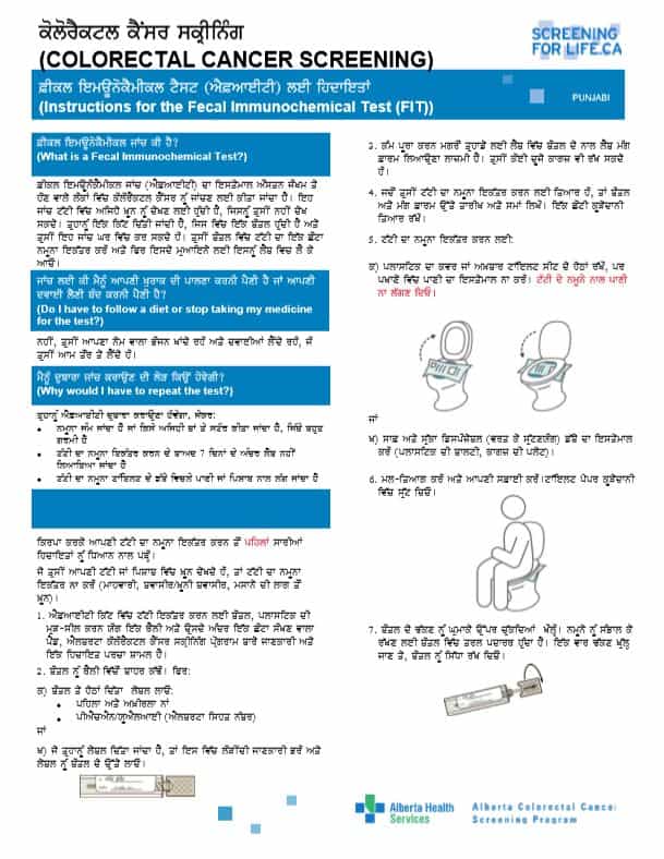 kolorYktl kYNsr skRIinMg (COLORECTAL CANCER SCREENING) &Ikl iemaUnokYmIkl tYst (AY&AweItI) leI ihdwieqW (Instructions for the Fecal Immunochemical Test (FIT)) s &Ikl iemaUnokYmIkl jWc kI hY? (What is a Fecal Immunochemical Test?) &Ikl iemaUnokYmIkl jWc (AY&AweItI) dw iesqymwl AOsqn joKm qy hox vwly lokW iv`c kolorYktl kYNsr nUM jWcx leI kIqw…