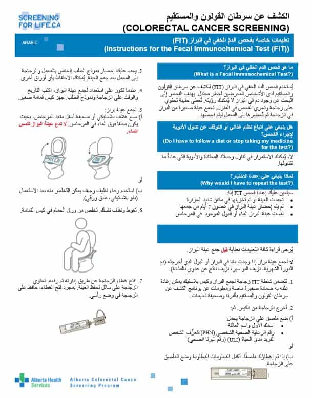 اﻟﻛﺷف ﻋن ﺳرطﺎن اﻟﻘوﻟون واﻟﻣﺳﺗﻘﯾم )(COLORECTAL CANCER SCREENING ﺗﻌﻠﯾﻣﺎت ﺧﺎﺻﺔ ﺑﻔﺣص اﻟد ّم اﻟﺧﻔﻲ ﻓﻲ اﻟﺑراز )(FIT ARABIC ))(Instructions for the Fecal Immunochemical Test (FIT ﻣﺎ ھو ﻓﺣص اﻟدم اﻟﺧﻔﻲ ﻓﻲ اﻟﺑراز؟ )?(What is a Fecal Immunochemical Test ﯾُﺴﺘﺨﺪم ﻓﺤﺺ اﻟﺪم اﻟﺨﻔﻲ ﻓﻲ اﻟﺒﺮاز ) (FITﻟﻠﻜﺸﻒ ﻋﻦ ﺳﺮطﺎن اﻟﻘﻮﻟﻮن واﻟﻤﺴﺘﻘﯿﻢ…