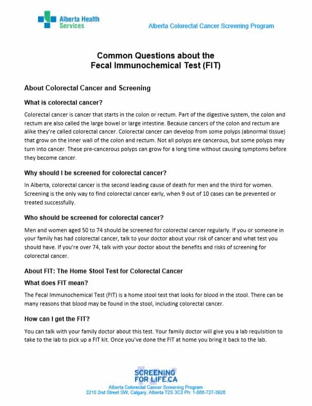 Alberta Colorectal Cancer Screening Program Common Questions about the Fecal Immunochemical Test (FIT) About Colorectal Cancer and Screening What is colorectal cancer? Colorectal cancer is cancer that starts in the colon or rectum. Part of the digestive system, the colon and rectum are also called the large bowel or large…
