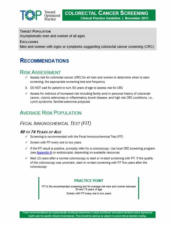 COLORECTAL CANCER SCREENING Clinical Practice Guideline | November 2013 TARGET POPULATION Asymptomatic men and women of all ages EXCLUSIONS Men and women with signs or symptoms suggesting colorectal cancer screening (CRC) RECOMMENDATIONS RISK ASSESSMENT Assess risk for colorectal cancer (CRC) for all men and women to determine when to…