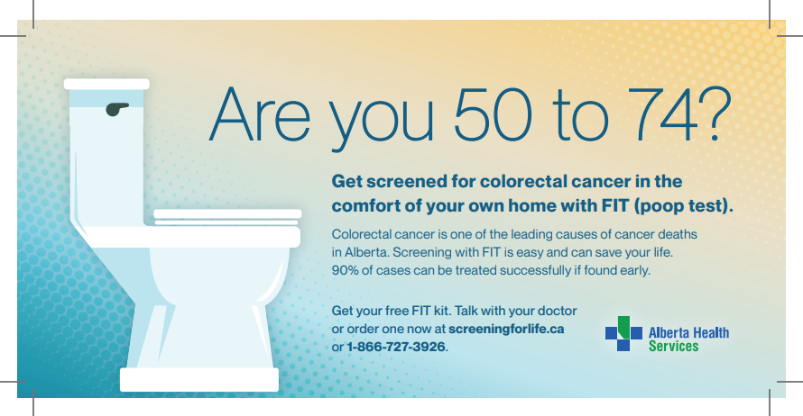 Are you 50 to 74? Get screened for colorectal cancer in the comfort of your own home with FIT (poop test). Colorectal cancer is one of the leading causes of cancer deaths in Alberta. Screening with FIT is easy and can save your life. 90% of cases can be treated…