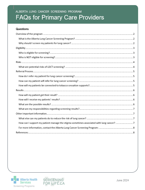 469261 301625 ALBERTA LUNG CANCER SCREENING PROGRAM FAQs for Primary Care Providers Questions TOC o 1 2 h z u Overview of the program PAGEREF Toc152335030 h 2 What is the Alberta Lung Cancer Screening Program PAGEREF Toc152335031 h 2 Why should I screen my patients for lung cancer PAGEREF…