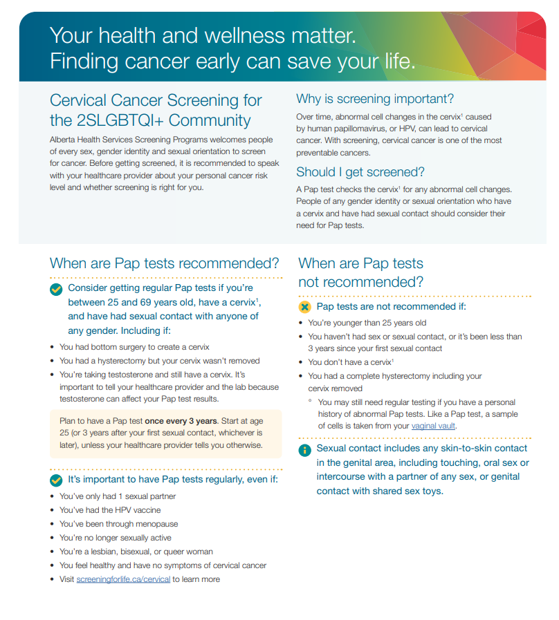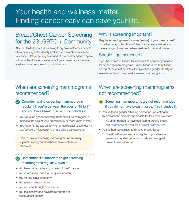 Your health and wellness matter. Finding cancer early can save your life. Breast/Chest Cancer Screening for the 2SLGBTQI+ Community Alberta Health Services Screening Programs welcomes people of every sex, gender identity and sexual orientation to screen for cancer. Before getting screened, it is recommended to speak with your healthcare provider…