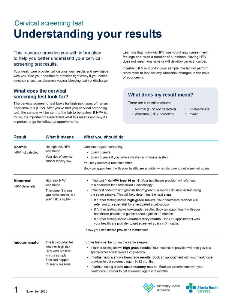 Cervical screening test Understanding your results This resource provides you with information to help you better understand your cervical screening test results. Your healthcare provider will discuss your results and next steps with you. See your healthcare provider right away if you notice symptoms, such as abnormal vaginal bleeding, pain…