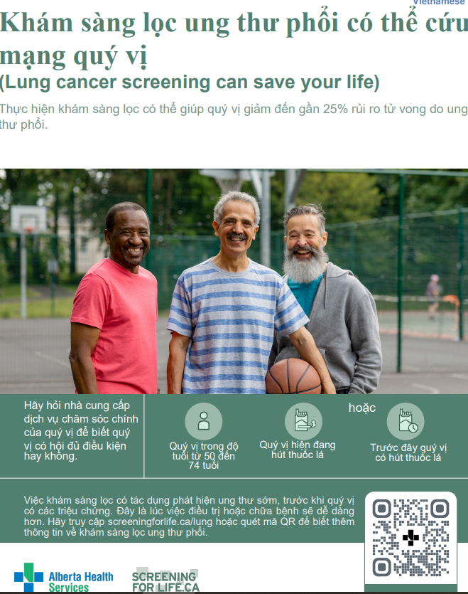 Vietnamese Bất kỳ ai cũng có thể mắc bệnh ung thư phổi. (If you have lungs you can get lung cancer.) Mặc dù hút thuốc là nguyên nhân phổ biến nhất gây bệnh ung thư phổi nhưng cũng có các nguy cơ khác bao gồm phơi nhiễm với radon, amiăng…