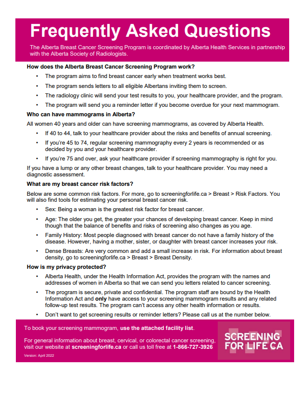 Frequently Asked Questions The Alberta Breast Cancer Screening Program is coordinated by Alberta Health Services in partnership with the Alberta Society of Radiologists. How does the Alberta Breast Cancer Screening Program work? • The program aims to find breast cancer early when treatment works best. • The program sends letters…