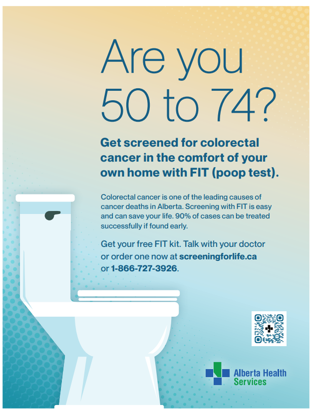 Are you 50 to 74? Get screened for colorectal cancer in the comfort of your own home with FIT (poop test). Colorectal cancer is one of the leading causes of cancer deaths in Alberta. Screening with FIT is easy and can save your life. 90% of cases can be treated…