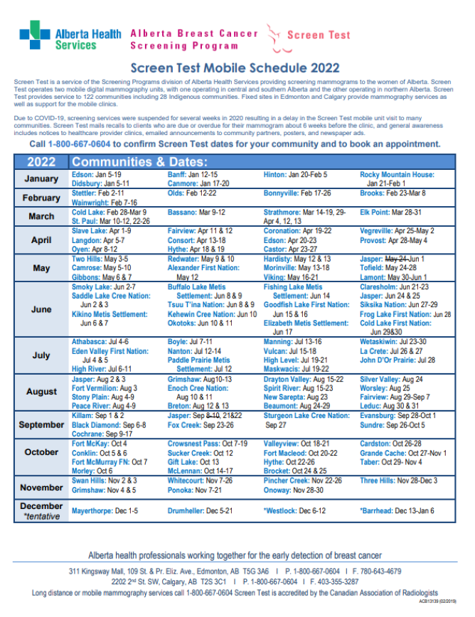 Screen Test Mobile Schedule 2022 Screen Test is a service of the Screening Programs division of Alberta Health Services providing screening mammograms to the women of Alberta. Screen Test operates two mobile digital mammography units, with one operating in central and southern Alberta and the other operating in northern Alberta.…