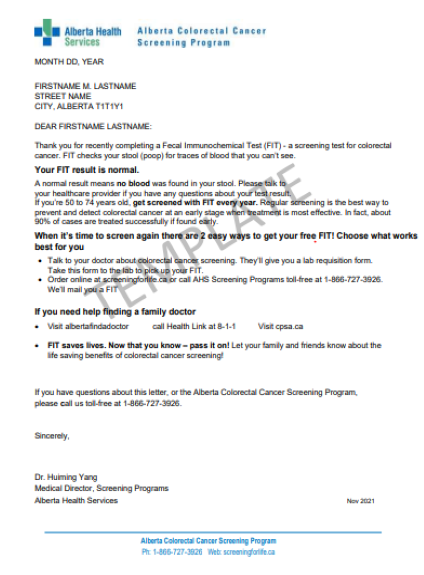 MONTH DD, YEAR FIRSTNAME M. LASTNAME STREET NAME CITY, ALBERTA T1T1Y1 DEAR FIRSTNAME LASTNAME: Thank you for recently completing a Fecal Immunochemical Test (FIT) - a screening test for colorectal cancer. FIT checks your stool (poop) for traces of blood that you can’t see. Your FIT result was normal. A…