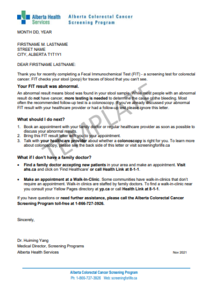 MONTH DD, YEAR FIRSTNAME M. LASTNAME STREET NAME CITY, ALBERTA T1T1Y1 DEAR FIRSTNAME LASTNAME: Thank you for recently completing a Fecal Immunochemical Test (FIT) - a screening test for colorectal cancer. FIT checks your stool (poop) for traces of blood that you can’t see. Your FIT result was abnormal. An…