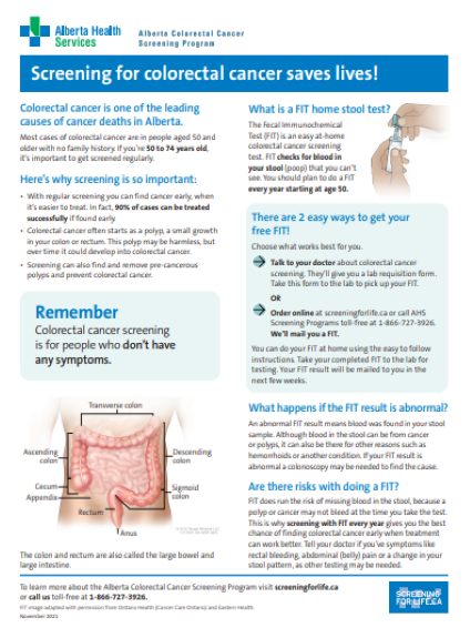 January 2022 Information for Primary Care Providers FIT Mail Out Initiative Starting in January 2022, eligible Albertans aged 50 to 74 will have the option to order a Fecal Immunochemical Test (FIT) online at ScreeningforLife.ca or by calling AHS Screening Programs. Eligibility will be determined through a selfassessment questionnaire. Individuals…