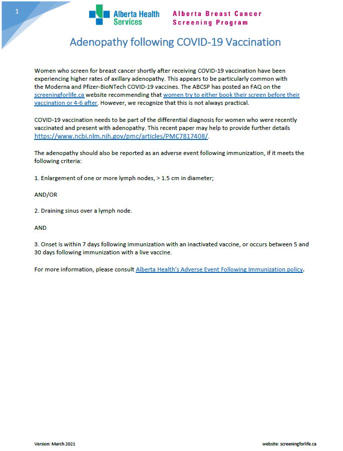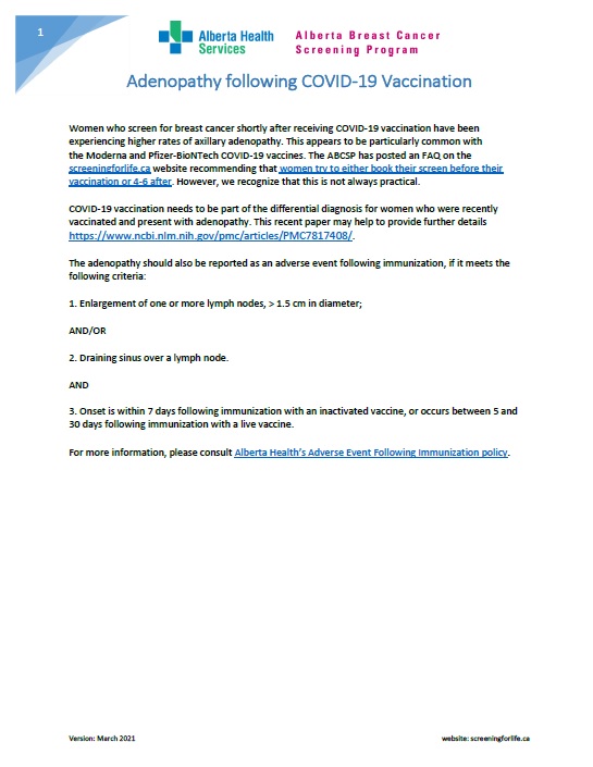 1 Adenopathy following COVID-19 Vaccination Women who screen for breast cancer shortly after receiving COVID-19 vaccination have been experiencing higher rates of axillary adenopathy. This appears to be particularly common with the Moderna and Pfizer-BioNTech COVID-19 vaccines. The ABCSP has posted an FAQ on the screeningforlife.ca website recommending that women…