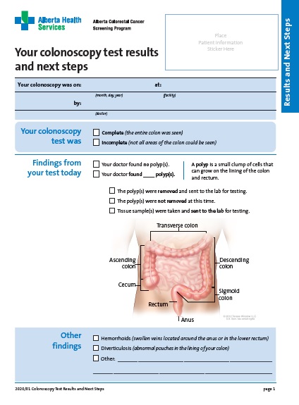 Your colonoscopy test results and next steps Your colonoscopy was on: Results and Next Steps Place Patient Information Sticker Here at: (month, day, year) (facility) by: (doctor) Your colonoscopy test was Findings from your test today Complete (the entire colon was seen) Incomplete (not all areas of the colon could…
