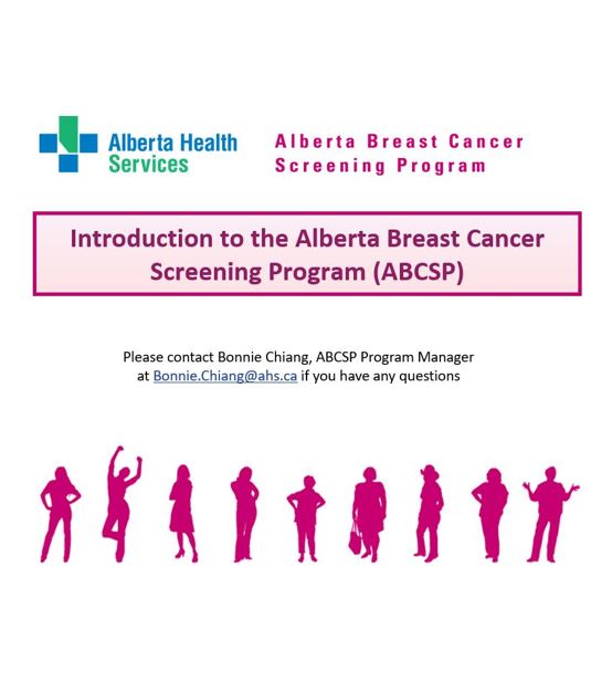 Introduction to the Alberta Breast Cancer Screening Program ABCSP Please contact Bonnie Chiang ABCSP Program Manager at Bonnie Chiang ahs ca if you have any questions What is the ABCSP http www topalbertadoctors org download 244 breast cancer summary pdf 20170503164519 Led by AHS Screening Programs within the Population Public…