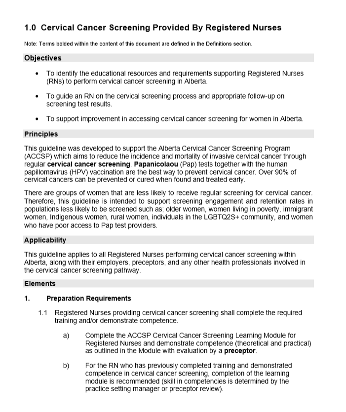 1.0 Cervical Cancer Screening Provided By Registered Nurses Note: Terms bolded within the content of this document are defined in the Definitions section. Objectives • To identify the educational resources and requirements supporting Registered Nurses (RNs) to perform cervical cancer screening in Alberta. • To guide an RN on the…