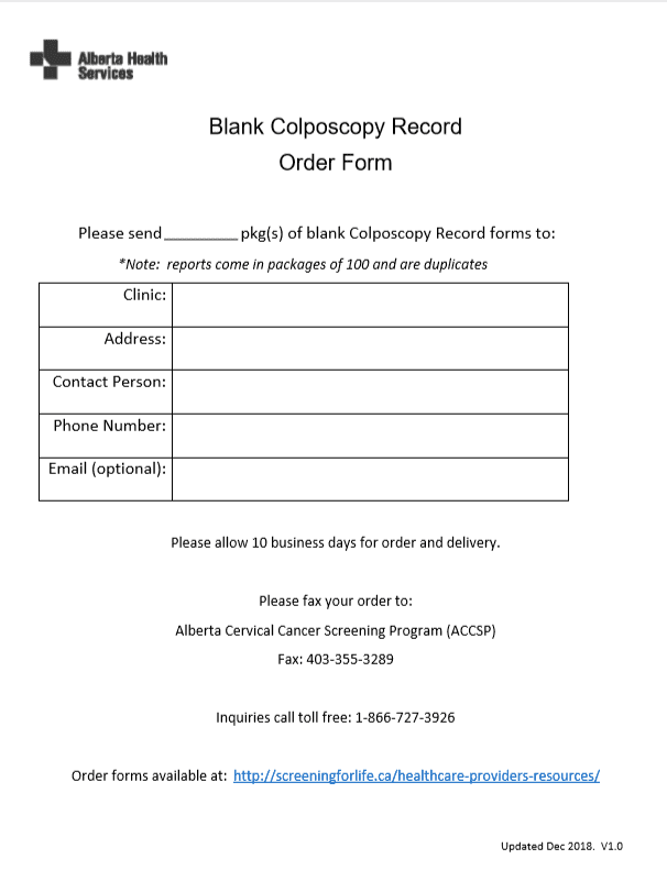 Blank Colposcopy Record Order Form Please send pkg(s) of blank Colposcopy Record forms to: *Note: reports come in packages of 100 and are duplicates Clinic: Address: Contact Person: Phone Number: Email (optional): Please allow 10 business days for order and delivery. Please fax your order to: Alberta Cervical Cancer Screening…