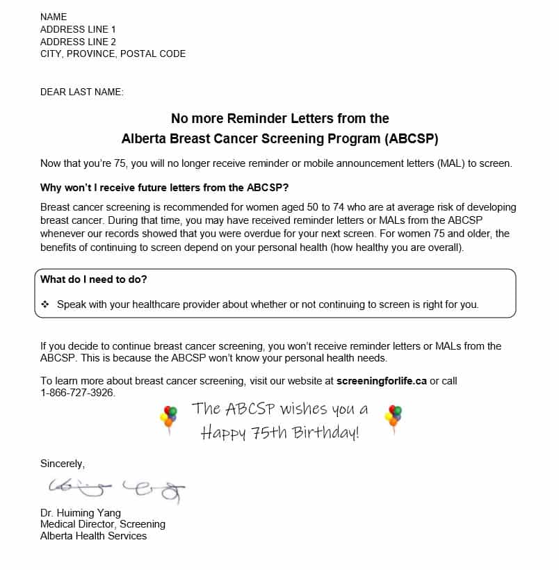 DATE NAME ADDRESS LINE 1 ADDRESS LINE 2 CITY, PROVINCE, POSTAL CODE DEAR LAST NAME: No more Reminder Letters from the Alberta Breast Cancer Screening Program (ABCSP) Now that you’re 75, you will no longer receive reminder or mobile announcement letters (MAL) to screen. Why won’t I receive future letters…