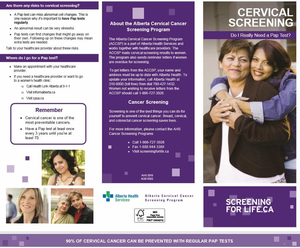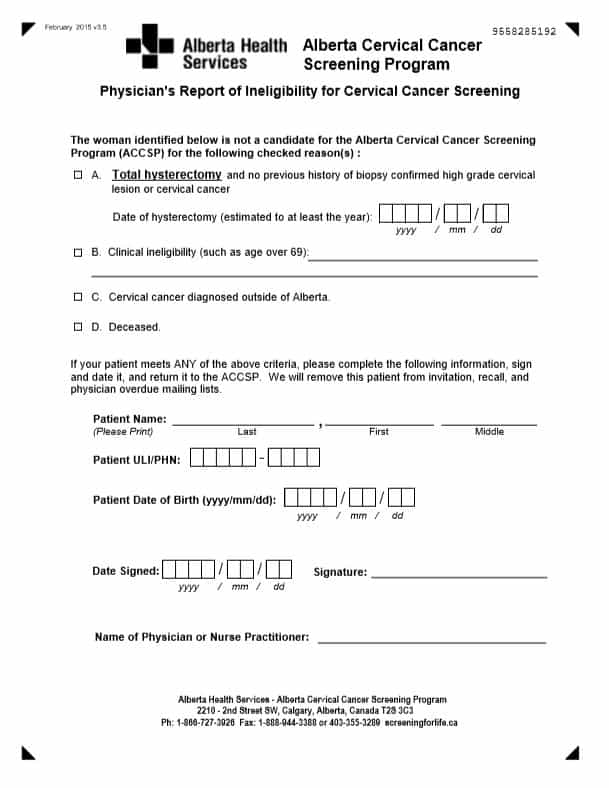 February 2015 v3.5 9558285192 9558285192 Alberta Cervical Cancer Screening Program 9558285192 Physician's Report of Ineligibility for Cervical Cancer Screening The woman identified below is not a candidate for the Alberta Cervical Cancer Screening Program (ACCSP) for the following checked reason(s) : A. Total hysterectomy and no previous history of biopsy…